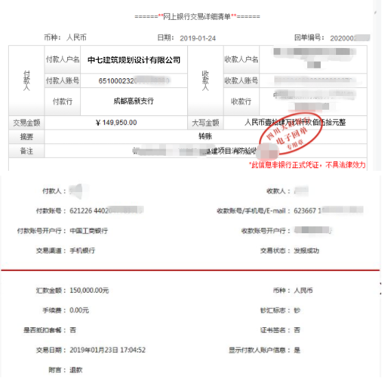 最终,这笔30万的押金通过两次转账的方式退还。