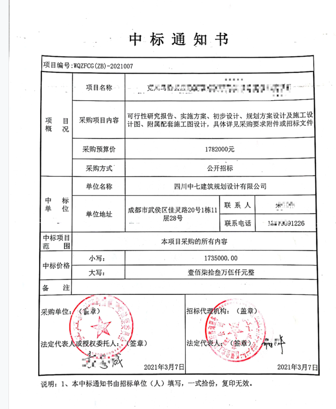 2021年3月7日,我公司(四川中七建筑规划设计有限公司)在某某县应急隔离点扩建项目设计服务采购项目中,凭借过硬的产品质量和扎实高效的工作作风,卓越的运作团队和良好的企业信誉,以绝对的优势顺利中标。在此向全国的分支机构和办事处同事通报喜讯。