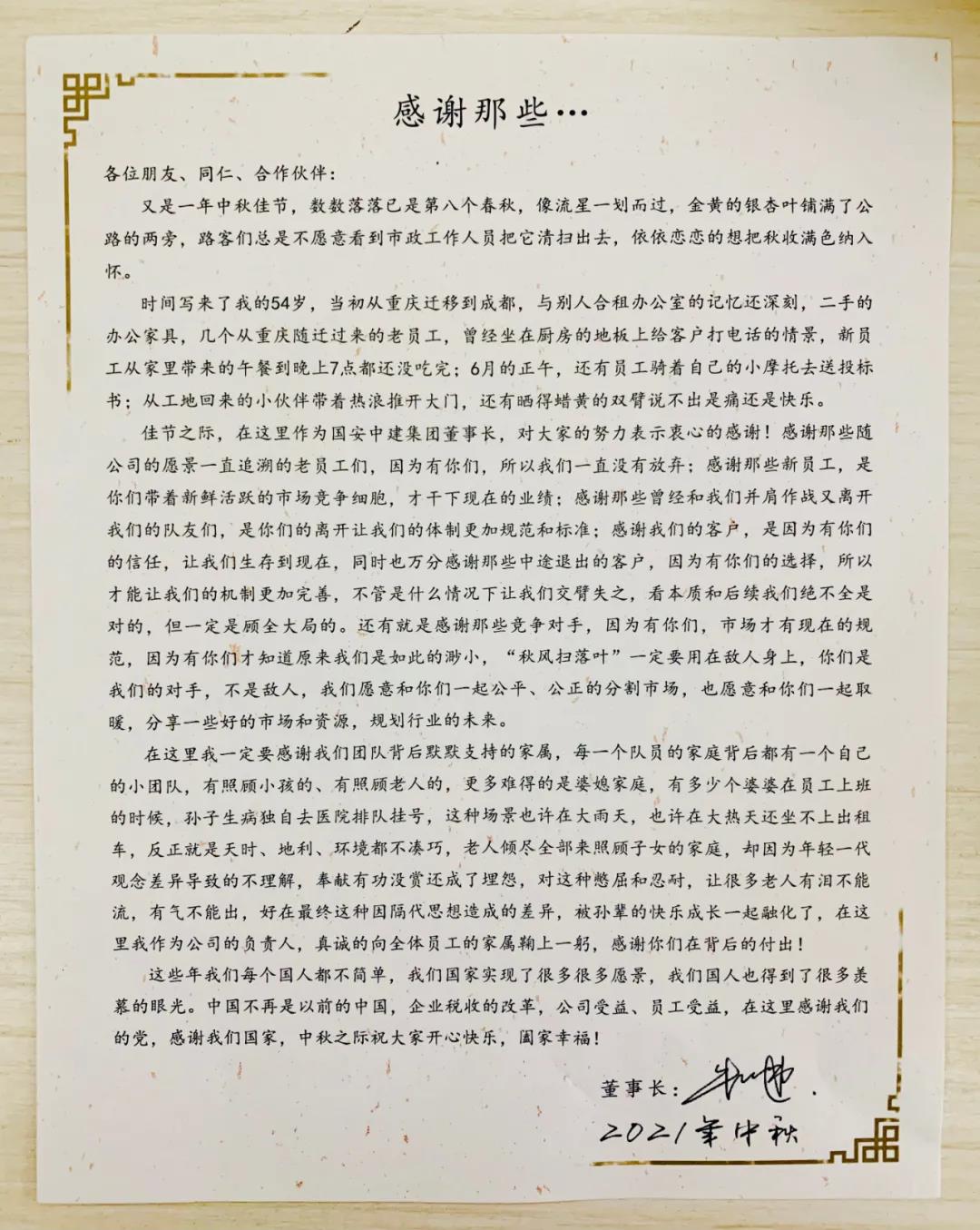 佳节之际,在这里作为国安中建集团董事长,对大家的努力表示衷心的感谢!感谢那些随公司的愿景一直追溯的老员工们,因为有你们,所以我们一直没有放弃;感谢那些新员工,是你们带着新鲜活跃的市场竞争细胞,才干下现在的业绩;感谢那些曾经和我们并肩作战又离开我们的队友们,是你们的离开让我们的体制更加规范和标准;感谢我们的客户,是因为有你们的信任,让我们生存到现在,也希望你们做大做强,也可以学习总公司的经营模式,甚至可以手把手的教,让我们携手共创未来,同时也万分感谢那些中途退出的客户,因为有你们的选择,所以才能让我们的机制更加完善,不管是什么情况下让我们交臂失之,看本质和后续我们绝不全是对的,但一定是顾全大局的。还有就是感谢那些竞争对手,因为有你们,市场才有现在的规范,因为有你们才知道原来我们是如此的渺小,“秋风扫落叶”一定要用在敌人身上,你们是我们的对手,不是敌人,我们愿意和你们一起公平、公正的分割市场,也愿意和你们一起取暖,分享一些好的市场和资源,规划行业的未来。