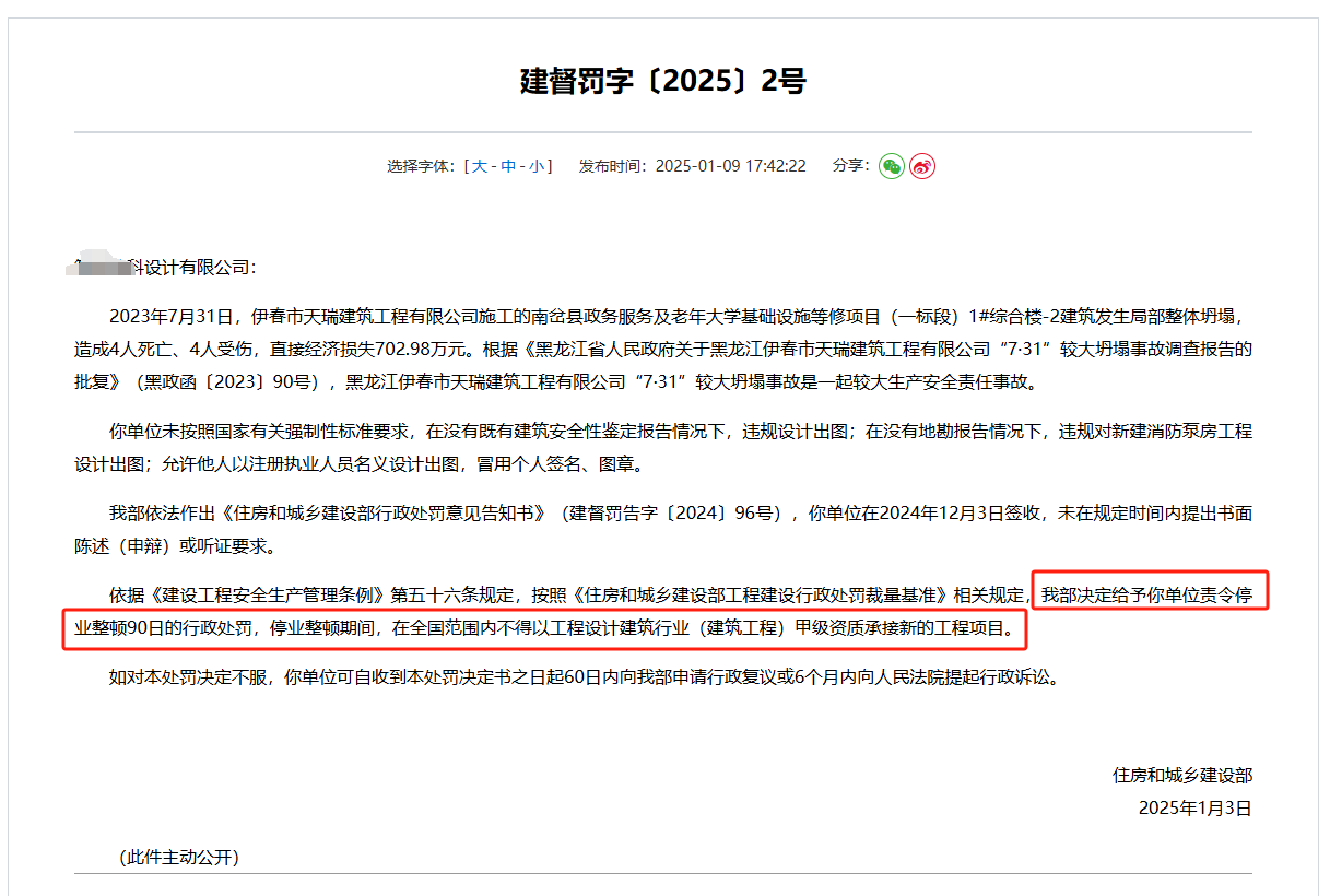 2025年1月9日,住建部发布了关于黑龙江伊春市天瑞建筑工程有限公司“7·31”较大坍塌事故的处罚文书建督罚字〔2025〕2号。